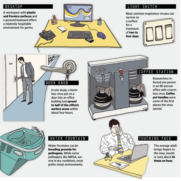 @WSJ Study: virus spread from front door of an office to half the employees within 4 hrs. http://on.wsj.com/1yG1oM8 pic.twitter.com/JMBlViWoaT