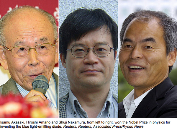 “@WSJ: 3 Japanese-born scientists were awarded the Nobel Prize in Physics http://on.wsj.com/1s7LEwC pic.twitter.com/2vGKtwWYYs” MSZ:LED light.
