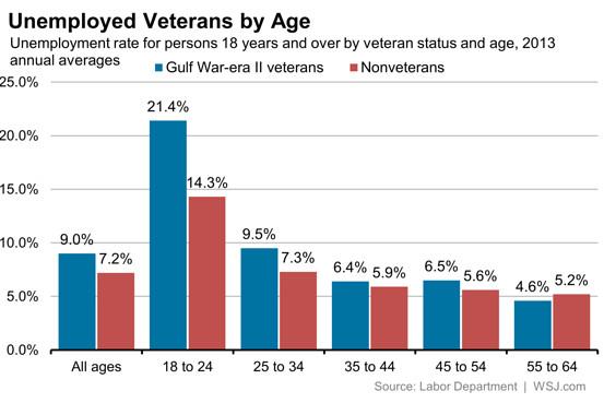 "@WSJ: Veterans age 18 to 24 have an unemployment rate of 21.4% vs. 14.3% for nonveterans: http://on.wsj.com/1494f2G pic.twitter.com/1WJtGELDHY"
