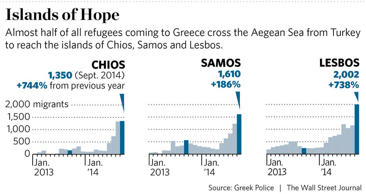 Refugees cross a narrow sea passage to reach the EU. Our in-depth look at the Syrian exodus http://on.wsj.com/1v8u1Qv pic.twitter.com/L2Mt3HeTAs