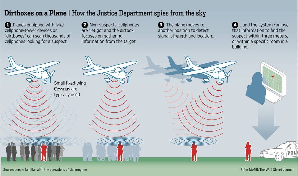 @WSJ U.S. Jus Dept. is scooping up phone data w/ devices on planes that mimic cell towers. http://on.wsj.com/1EKj4FW pic.twitter.com/u5DirHJJUE hmm
