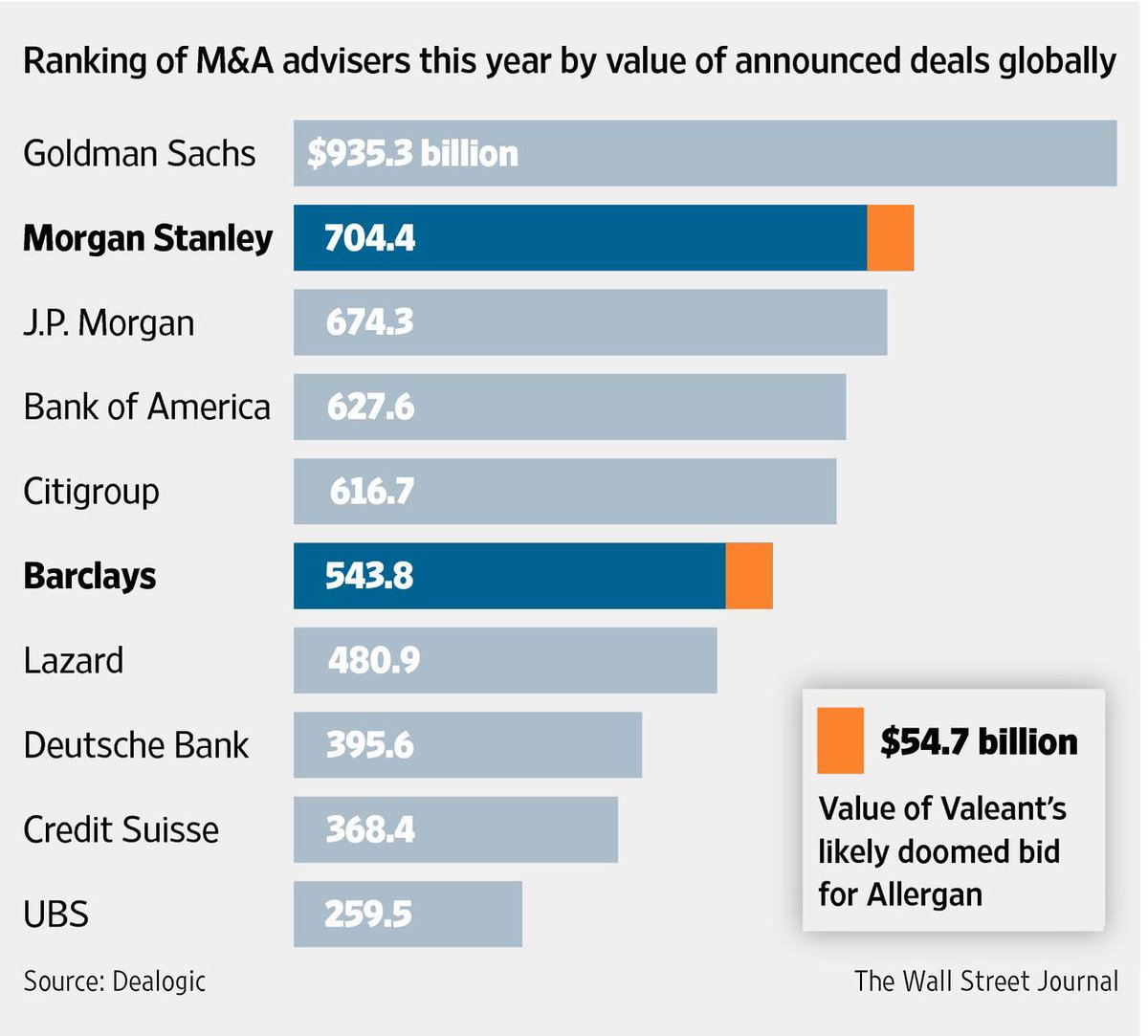 Goldman cements its position as top bank for M&A in one of the busiest years in the business http://on.wsj.com/1wWGwcW pic.twitter.com/QVxkOtNikv