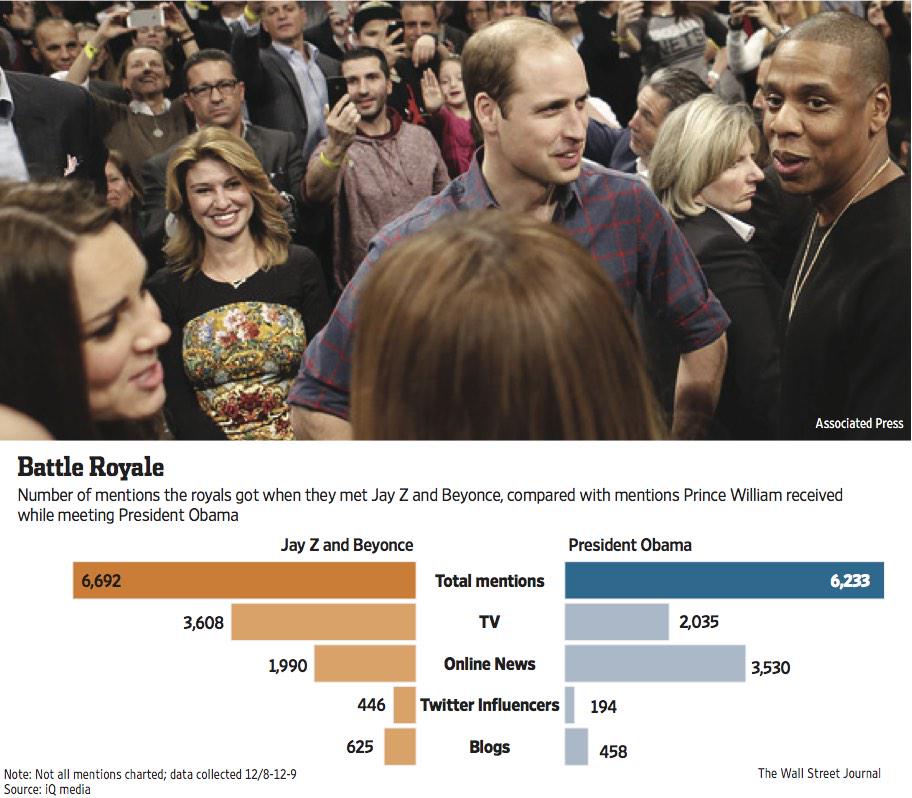 @WSJ: was more discussion about the royals meeting Beyonce and Jay Z than President Obama: http://on.wsj.com/1GdT9XQ pic.twitter.com/4Pv1kze3br”