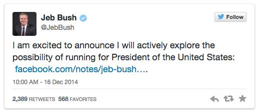 @twitter@WSJ: Jeb Bush announces run for prez http://on.wsj.com/1vVHghg pic.twitter.com/BLIp4wx0bM”