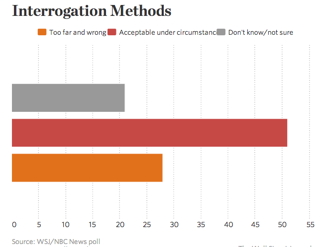@WSJ: Poll: Most Americans don’t object to the CIA’s interrogation techniques that some call torture pic.twitter.com/ZeY3hPVcbT”