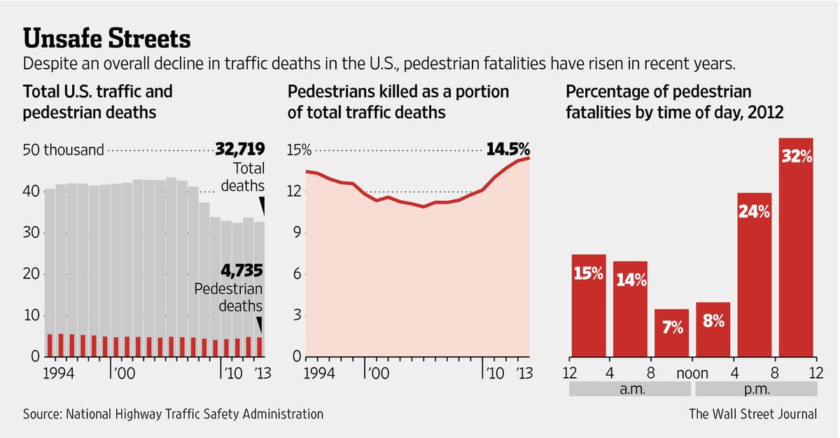 RT“@WSJ: Despite an overall decline in traffic deaths, U.S. pedestrian fatalities have risen: http://on.wsj.com/1zgQ60v pic.twitter.com/OUjeXZ1YRA”
