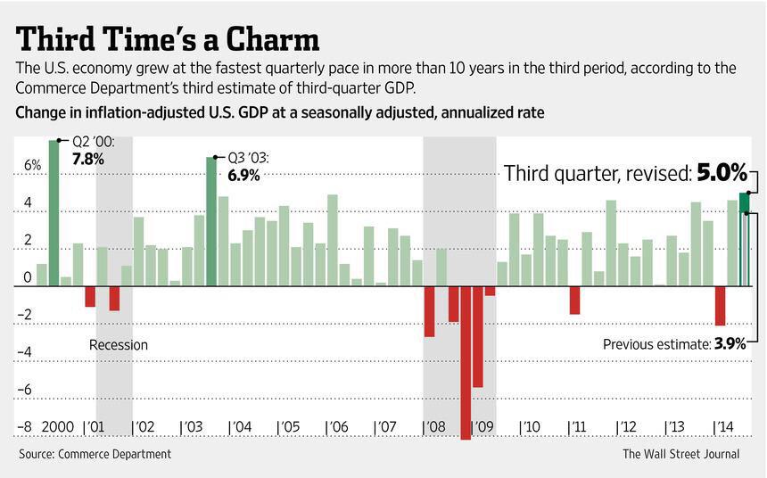 @WSJ GDP up at 5% annual pace is great. The rapidly strengthening labor mkt & plunging gas prices should keep the econ stronger in 2015.