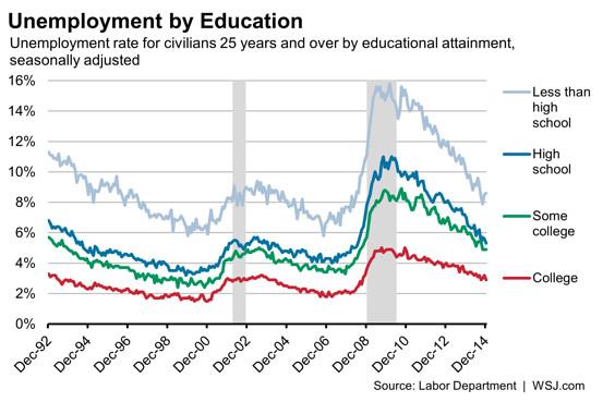 @WSJ: Unemployment is 8.6% among those w/out HS diploma & 2.9% for college grads. http://on.wsj.com/14zEzMt pic.twitter.com/aJYqUJXFzX”