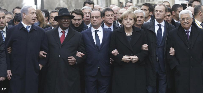 World Leaders walk arm-in-arm during #ParisMarch ...Why no POTUS? @wsj http://on.wsj.com/14J8tPe pic.twitter.com/Y4s5wTLsnw