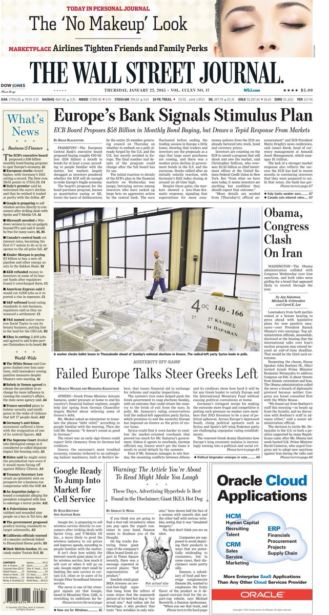 @WSJ: ECB's stimulus plan. Obama, Congress clash on Iran. Here's an early look at today's front page: pic.twitter.com/Fnq9Amhp8O”#headlines