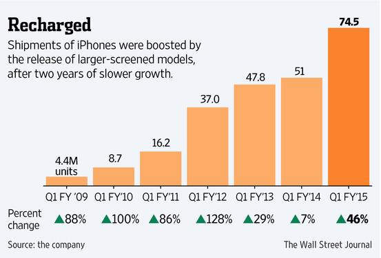 “@WSJ: Apple sold 74.5 million iPhones in the q, 46% above a year earlier. http://on.wsj.com/1LfEWNB $AAPL pic.twitter.com/NwIIyGwaVE”@libarraram