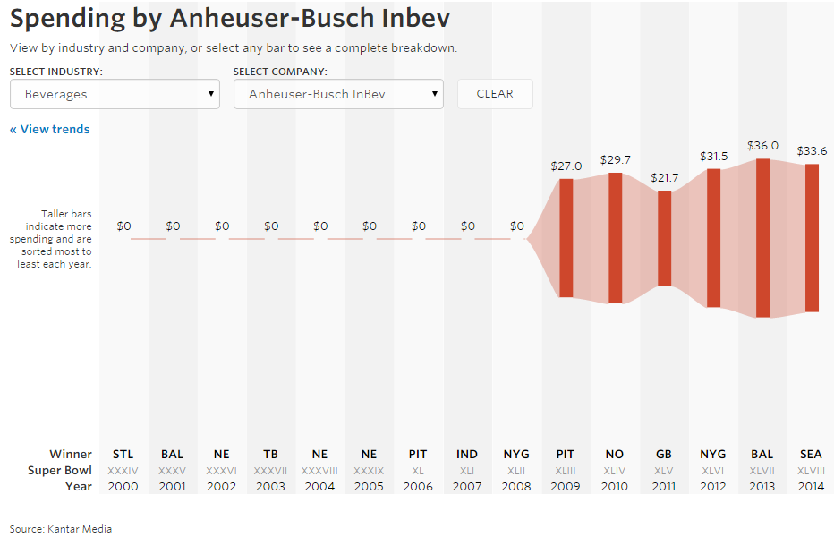 “@WSJ: Anheuser-Busch Inbev spent $33.6 million on#SuperBowl ads in 2014: http://on.wsj.com/1tuPliz pic.twitter.com/1q8v5bJwSE”