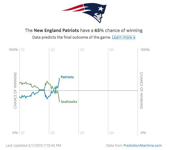 @WSJ: After a@patriots TD, they have a 65% chance of winning.#SuperBowl live blog: http://on.wsj.com/1DuSaR8 pic.twitter.com/qlljPQXM0B”#Data