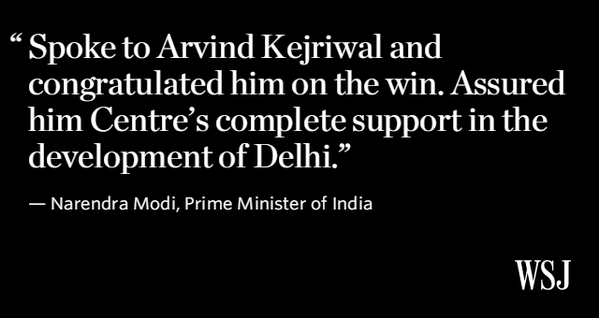@WSJ Delhi vote proves that India is a thriving democracy under PM Modi. His congratulatory message to AAP is clear. He wants development.