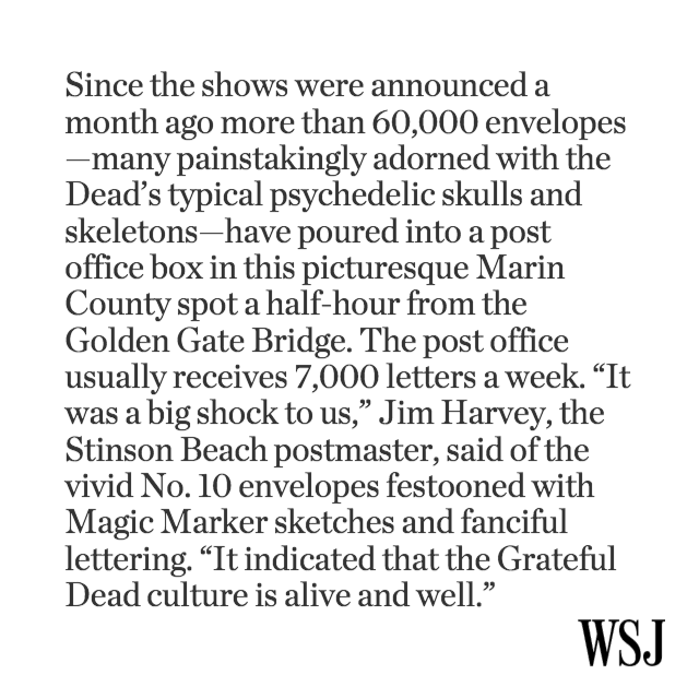 "@WSJ: For Grateful Dead’s final shows, a long strange trip ends in sea of mail http://on.wsj.com/1AHWZrz "