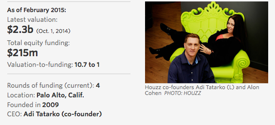 “@WSJ: Bil $ Startup #25: Houzz Home decor. Has 25 million users. Valued at $2.3B. http://on.wsj.com/19D2vRS pic.twitter.com/Xa3sOcOK4N” @laffylou