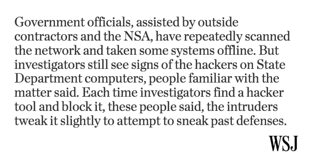 Ha! "@WSJ: Hackers are still in the State Department’s network three months after a breach http://on.wsj.com/1JtB4du pic.twitter.com/jsiPjMqGzJ”