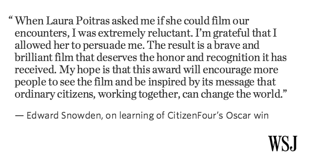 Wow “@WSJ: @ACLU has already sent out Edward Snowden’s reaction to the “Citizenfour” win: http://on.wsj.com/1DaCp2H pic.twitter.com/Yb7TICCTuE”