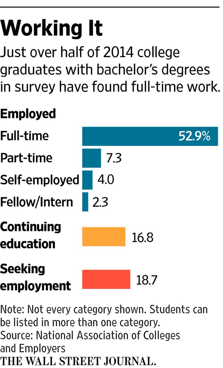 “@WSJ: Just over half of 2014 college graduates surveyed had found full-time work. http://on.wsj.com/1ALPAaD pic.twitter.com/o0nVcNpJPz”