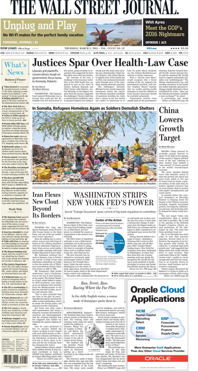 The health law, China's growth, the New York Fed and ferrets. Today's front page http://www.wsj.com pic.twitter.com/Mz88orc8Lo
