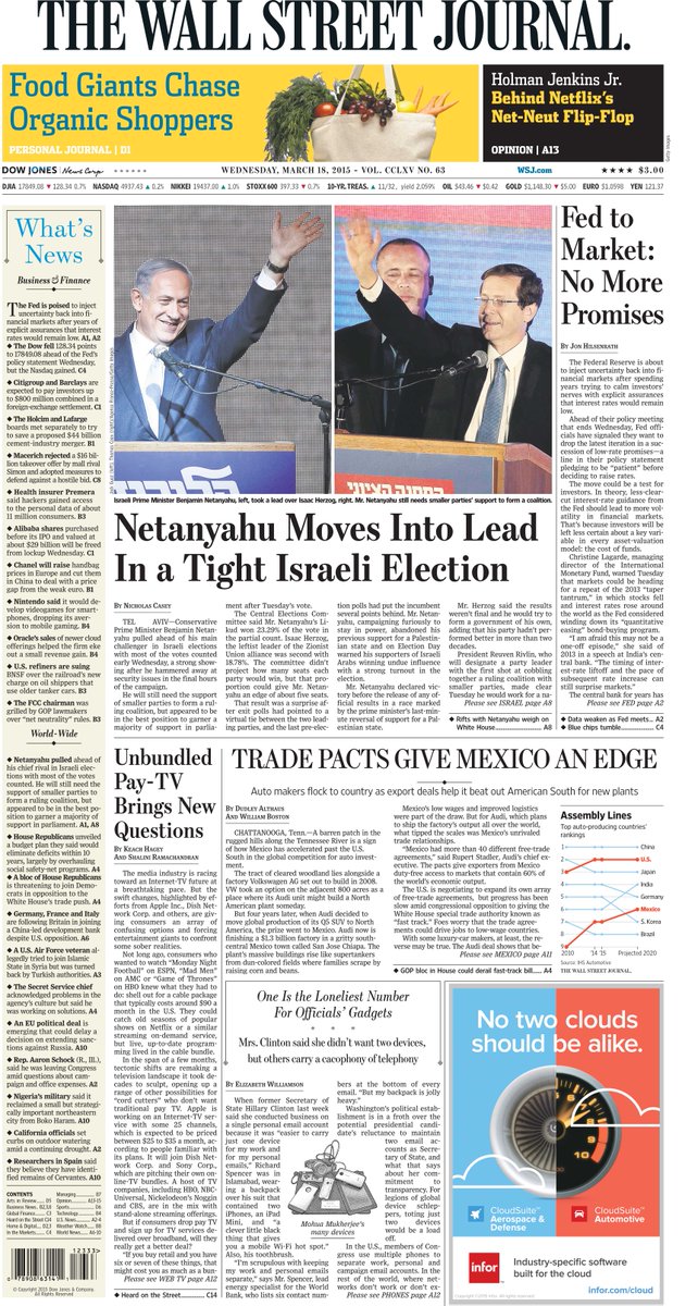 No Fed promises, Netanyahu, a Mexican trade pact and officials' gadgets. Today's front page http://www.wsj.com pic.twitter.com/ftRva3fthv