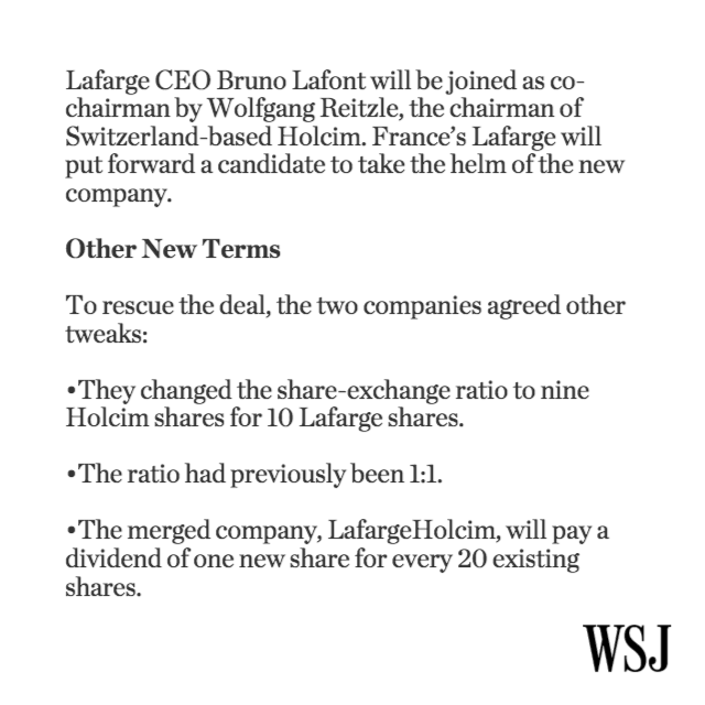 #M&A @WSJ: Cement companies #Holcim & #Lafarge have agreed on new merger terms http://on.wsj.com/1MTzOga pic.twitter.com/zL5mGiz46a #construction