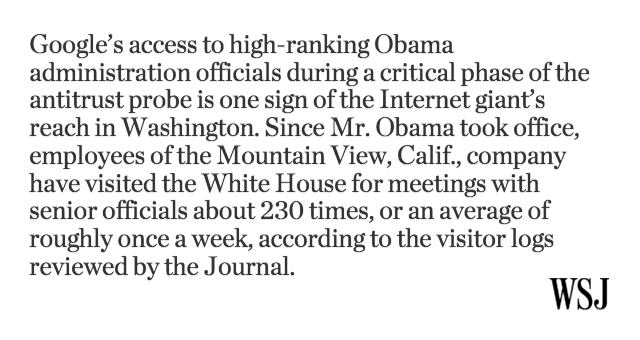 #Tech “@WSJ:$GOOGL employees average 1 W. House meeting a week during (this) administration http://on.wsj.com/1xy3UV9 pic.twitter.com/vwJo21UzQN”