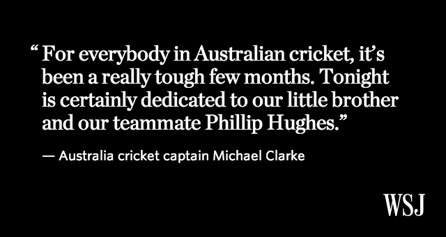 “@WSJ: Captain @MClarke23 dedicates Australia's #CWC15 win to Phillip Hughes. http://on.wsj.com/1xpSulZ pic.twitter.com/JBP5ZKaCRh”