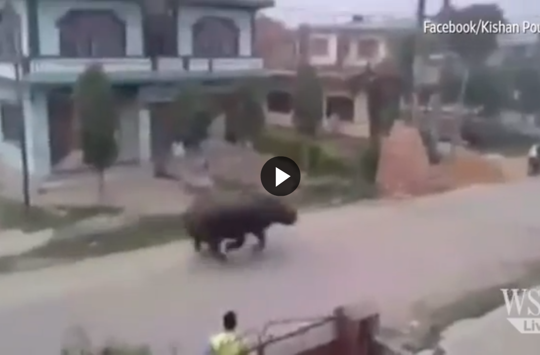 Hetauda, Nepal"@WSJ: Watch: Rampaging rhino terrifies residents as it runs through town. http://on.wsj.com/1GGcjaK pic.twitter.com/esBv7aK0Ba”