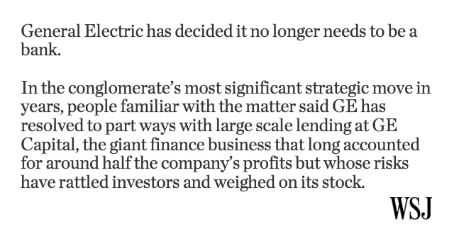 RT“@WSJ: GE to exit most of lending operations http://on.wsj.com/1HaLziO pic.twitter.com/lwydgWHQzR”