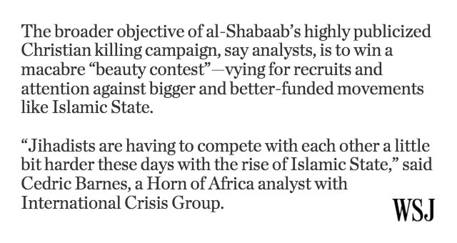 @WSJ: How al-Shabaab’s Christian killing campaign is evolving http://on.wsj.com/1GS5nHn Analysis by@HeidiVogt pic.twitter.com/YYjXjiEMIf” Duu!