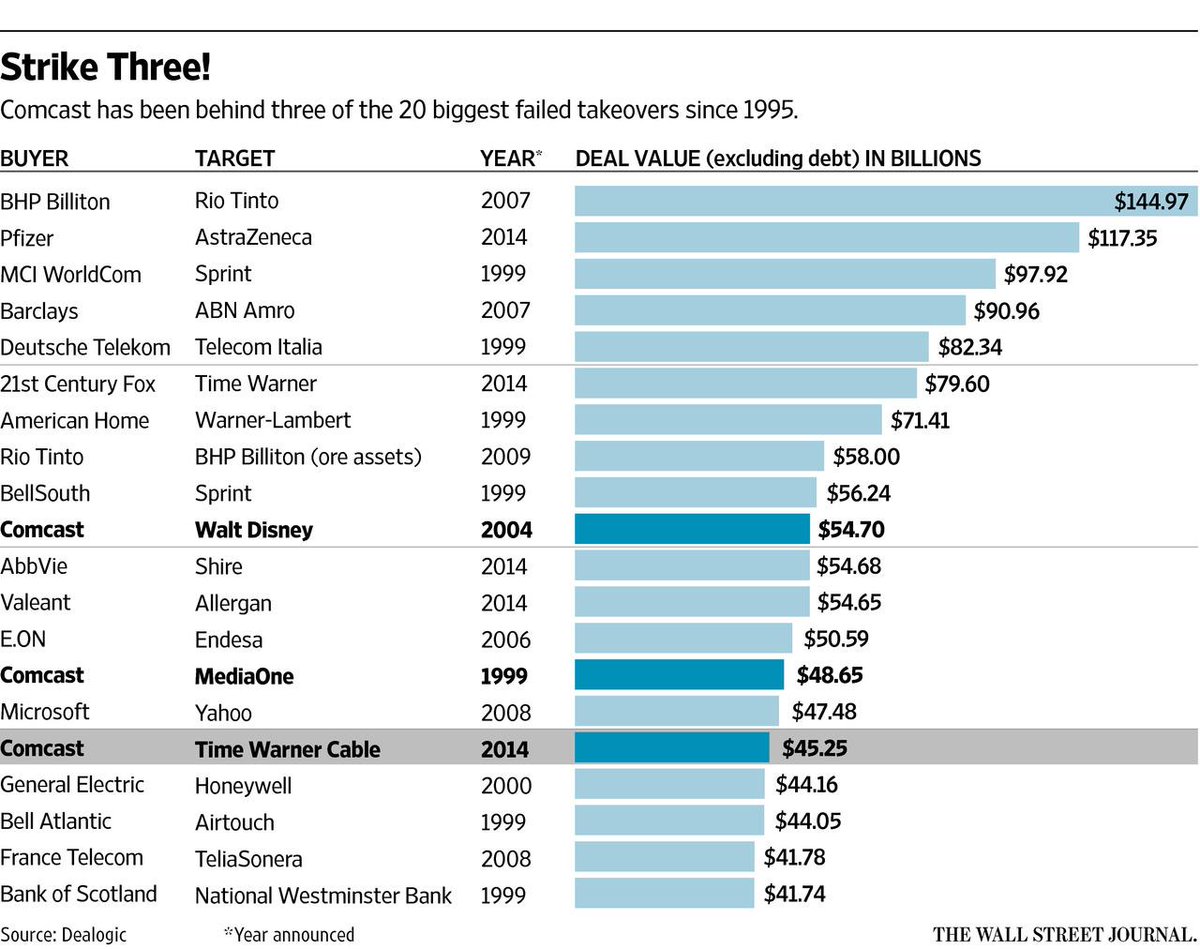 A pattern? "@WSJ: Comcast behind three of the 20 biggest failed takeovers since 1995: http://on.wsj.com/1I55dNK pic.twitter.com/pVITPXc2xA”