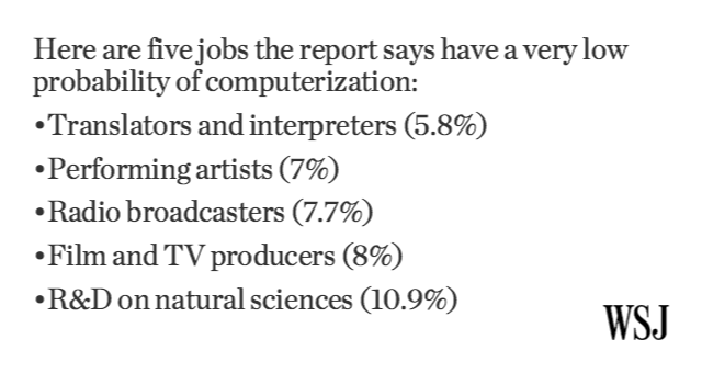 @WSJ: Creativity vs robots: jobs with a very low probability of computerization http://on.wsj.com/1bSVu0X pic.twitter.com/Dss5euzblX”