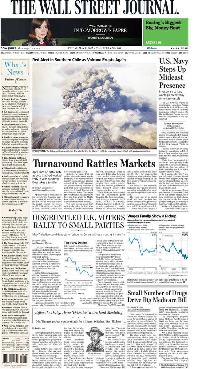 @WSJ: A volcano, the markets, the navy and a horse detective. Today's front page http://www.wsj.com pic.twitter.com/SV1HtRQdQB”