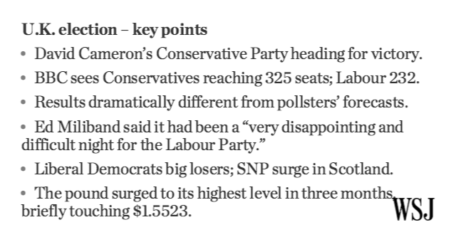 @WSJ: David Cameron’s Conservative Party heading for victory in U.K. general election. http://on.wsj.com/1IlwJrt pic.twitter.com/9KZyrq80iX
