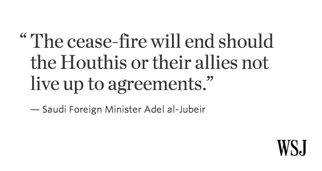 Saudi Arabia will implement a five-day cease-fire in Yemen on Tuesday evening. http://on.wsj.com/1EVbXv5 pic.twitter.com/V10zu1LHCF