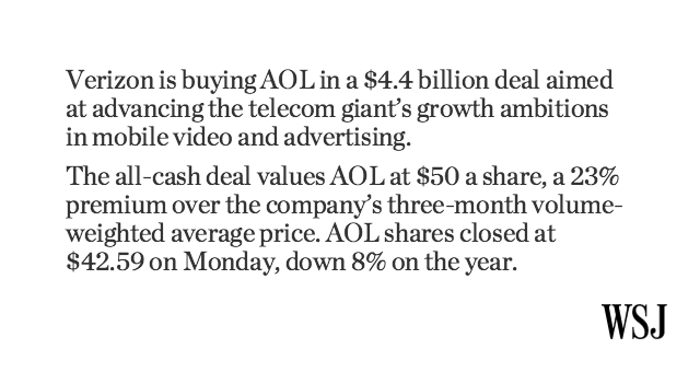 @WSJ: Verizon to buy AOL for $4.4 billion. Details: http://on.wsj.com/1QF28qj pic.twitter.com/BWFw2xmMri”