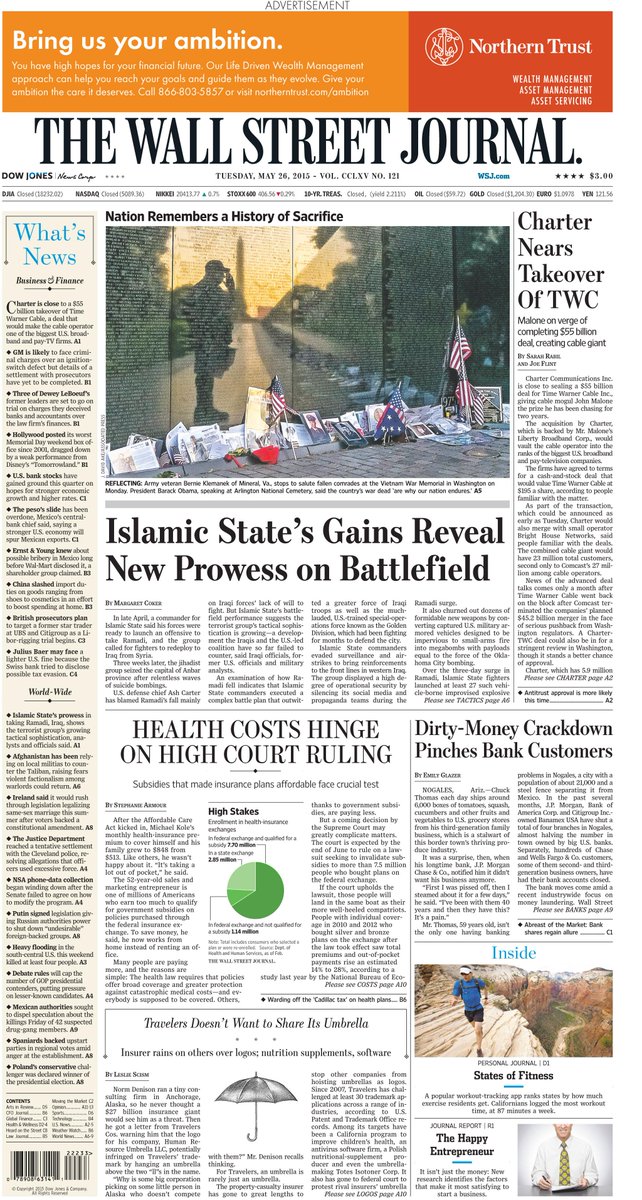 In today's paper, Islamic State's gains reveal new prowess on battlefield, Charter nears takeover of TWCpic.twitter.com/7gRMAKVVjq