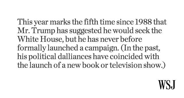 @WSJ this year marks the fifth time since 1988 that Trump is seeking the White House, but he has never before formally launched a campaignThanks. Twitter will use this to make your timeline better. UndoUndo