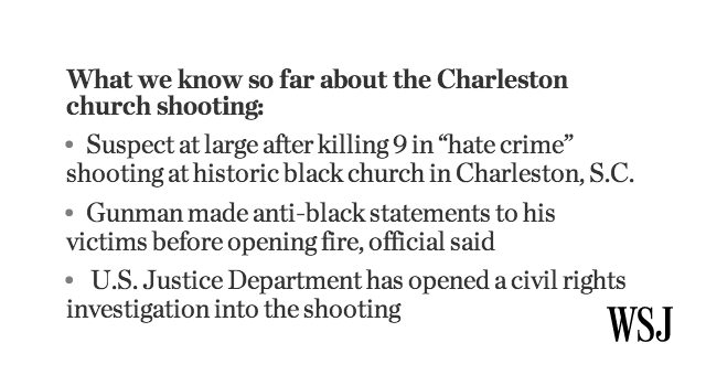 @WSJ: Here's what we know so far about the#CharlestonShooting: http://on.wsj.com/1BlvUwU pic.twitter.com/LCnfhq3keS” <<<shit Cra