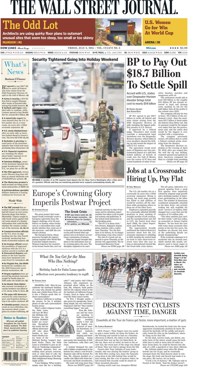BP payout, jobs, security, the euro, the man who has nothing and cycling, on the front page http://www.wsj.com pic.twitter.com/chJWH9m6aA