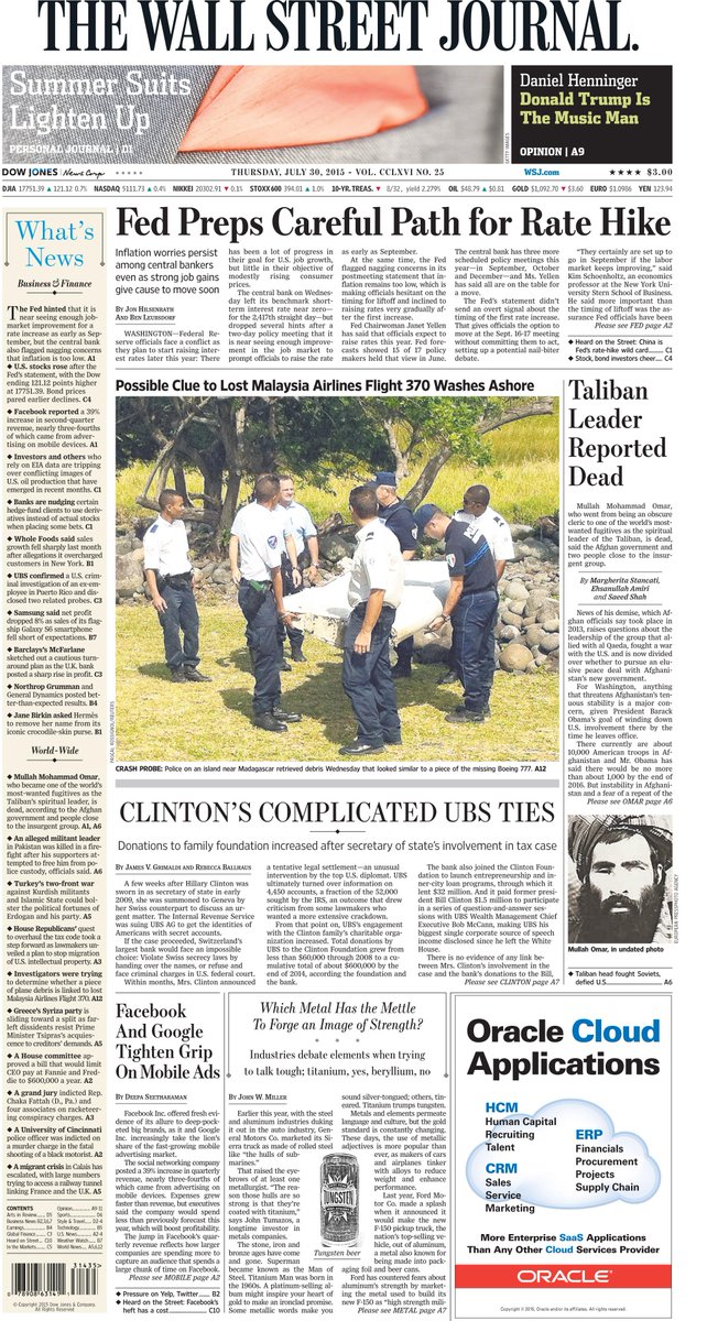 “@WSJ: Take an early look the front page of The Wall Street Journal http://www.wsj.com pic.twitter.com/kBoTjILusj”Story of Corrupt Clintons