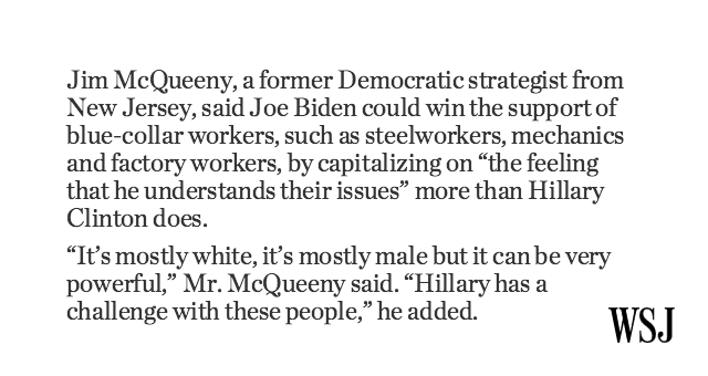 W respect 2 Mr. McQueeny I believe at this point #Biden will hav an easier time conncting w jst about every demo than #HillaryClinton. @WSJ