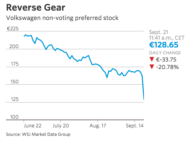 @WSJ: Volkswagen shares drop 20% on emissions allegations http://on.wsj.com/1Pj38it pic.twitter.com/W3ZpquM4fX”