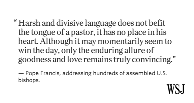 @WSJ Pope Francis warns bishops against taking a "harsh" stance on social issues. http://on.wsj.com/1NMWTVr by@francisxrocca#PopeInDC