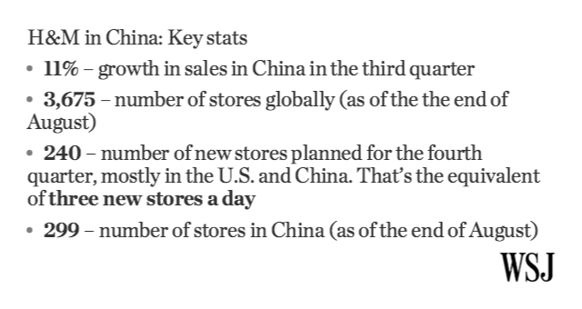 H&M bets big on China. It plans to open three new stores a day, mostly in the U.S. and China. http://on.wsj.com/1jdI4jm pic.twitter.com/4YR6HxchyO