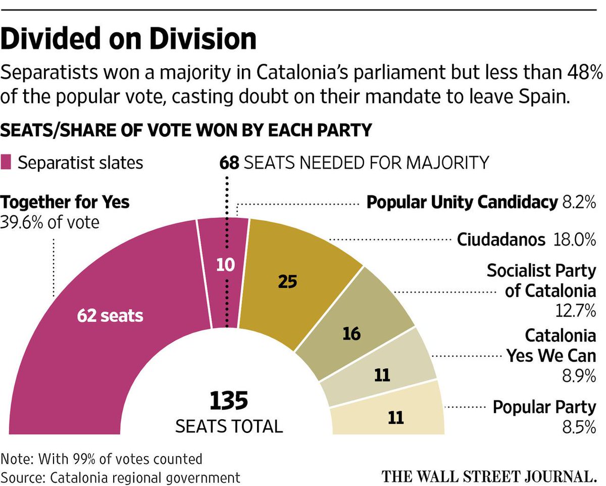 @WSJ Pro-independence MPs account for 72 out of 135 (only 47% popular vote).Just to amend the Catalan Statute of Autonomy, they need 90 MPs!