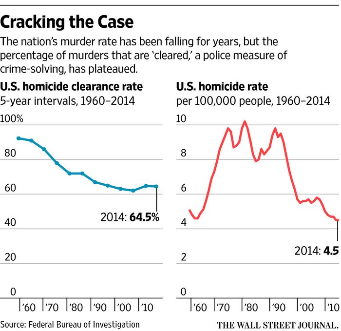@WSJ Only 65% of murders are solved? Even with DNA... - Interesting murder rate is the same as 1960 with much fewer arrests.Thanks. Twitter will use this to make your timeline better. UndoUndo