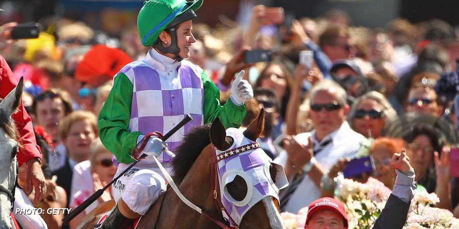 Michelle Payne, the first female jockey to win the Melbourne Cup. Photos of horses and hats: http://on.wsj.com/1MEsDhp pic.twitter.com/zDKyvI1qnc