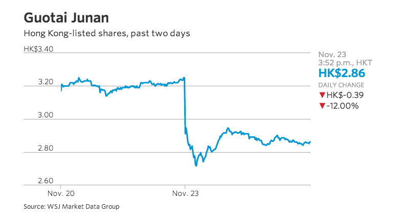 Guotai Junan plummets as chairman’s absence sparks China crackdown fears http://on.wsj.com/1HhvH0N pic.twitter.com/J5IzHRfCnO